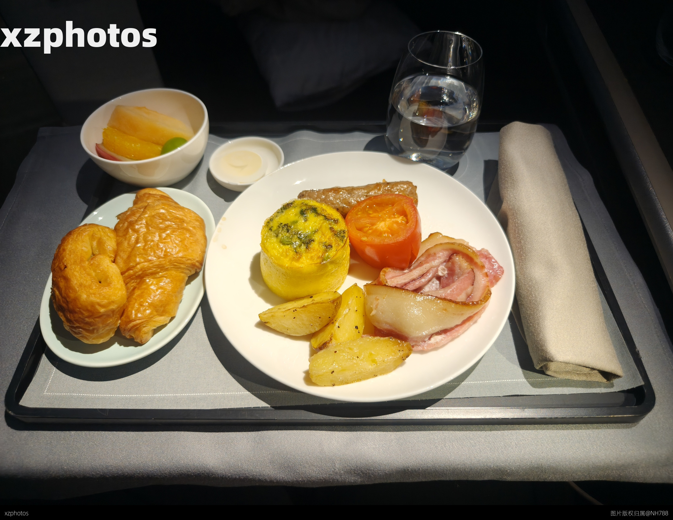 CX812香港-波士顿航班中公务舱的西式早餐: 時令鮮果、精選麵包 羽衣甘藍粟米梳乎厘 煙肉、豬肉腸、番茄、馬鈴薯